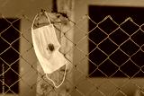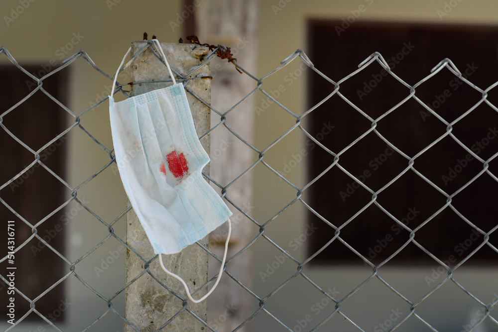 A medical bloodied mask lies on the fence. The concept of coronavirus and the apocalypse resulting from this disease has spread throughout the world.