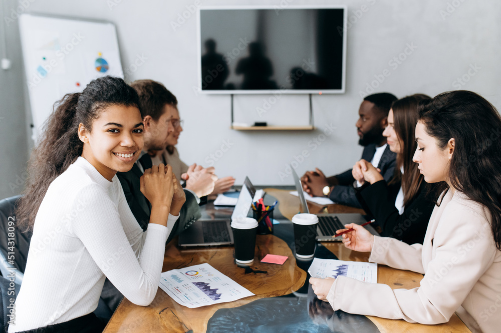 Concentrated group of business people at briefing meeting. Multiracial employers looking at financial graphs, brainstorming together. Focused colleagues discuss ideas, working on new project