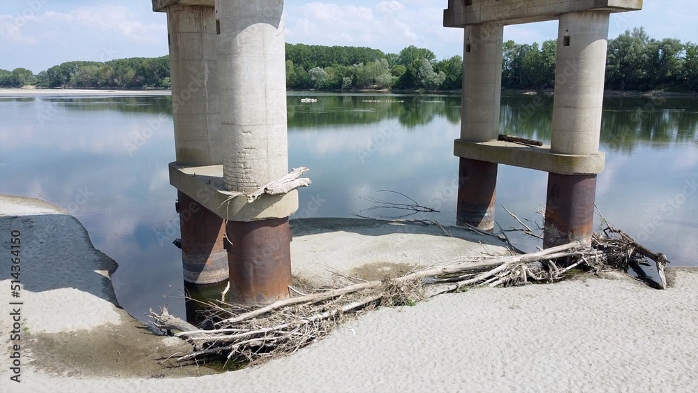 problems of drought and aridity in the almost waterless Po river with large expanses of sand and no water - climate change and global warming, Drone view in Ponte Spessa Arena Po - Save the planet