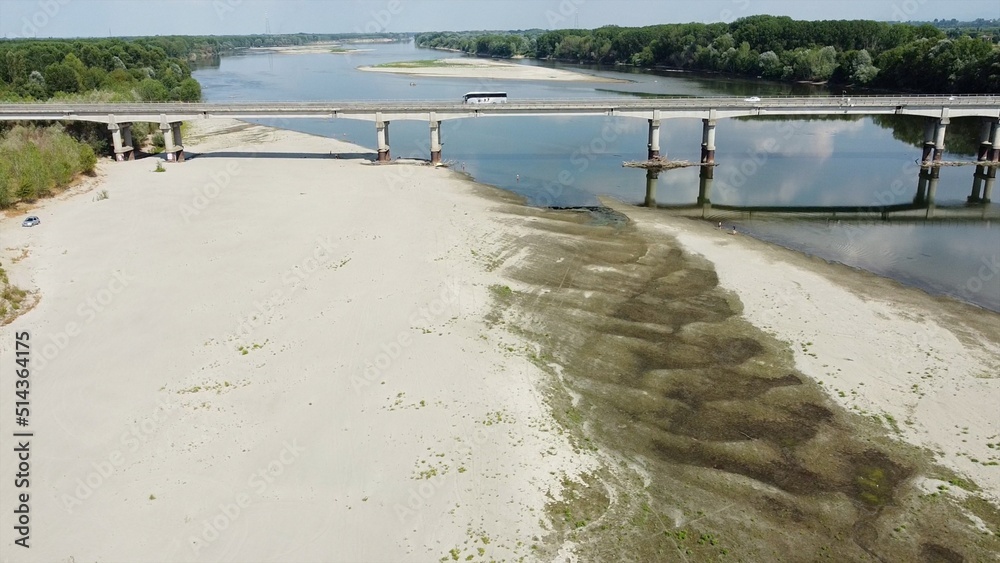 problems of drought and aridity in the almost waterless Po river with large expanses of sand and no water - climate change and global warming, Drone view in Ponte Spessa Arena Po - Save the planet