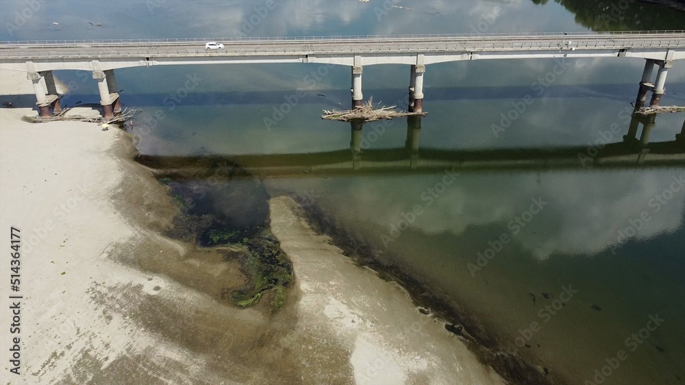 problems of drought and aridity in the almost waterless Po river with large expanses of sand and no water - climate change and global warming, Drone view in Ponte Spessa Arena Po - Save the planet