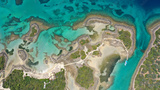 Aerial drone photo of tropical exotic volcanic island complex of Lihadonisia forming a blue lagoon and small islet of Monolia with turquoise clear organised beach, north Evia island, Greece