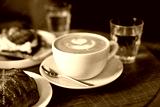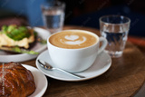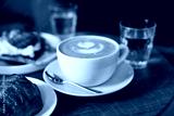 white cup of coffee closeup. Cappuccino at specialty coffee cafe. Coffee house and work of barista. Arabica 100% and glass of water
