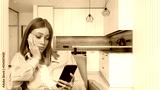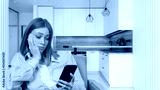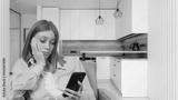 Young bored woman watching smartphone sitting in chair at home. Caucasian girl resting and using mobile phone