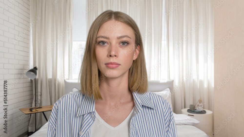 Close-uo of young woman speaking on video call, vlogger using smartphone talking at camera webcam online, selfie call, record lifestyle vlog, blogger online streaming at home