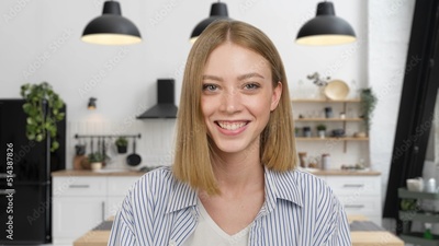 Close-uo of young woman speaking on video call, vlogger talking at camera webcam online, selfie call, record lifestyle vlog, blogger online streaming at home