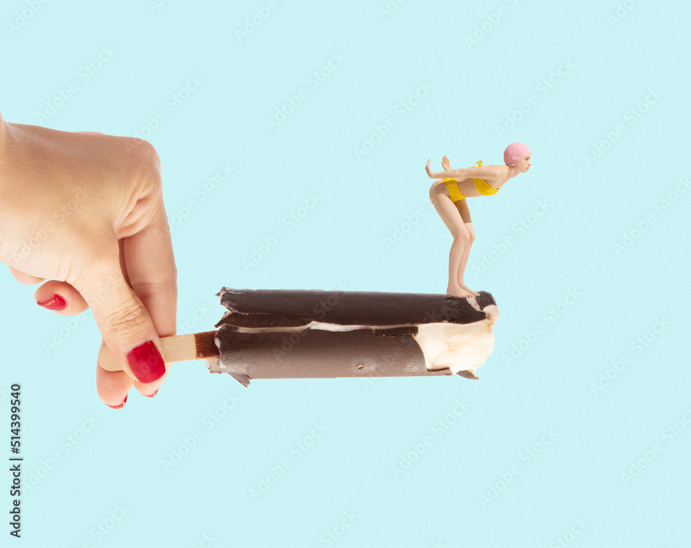 Contemporary art collage. Creative colorful design with young woman standing on ice cream and preparing to dive