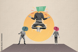 Composite collage picture of three people black white gamma punctuation marks instead head think make decisions solutions