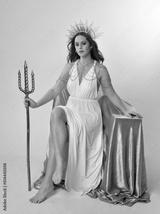 Full length portrait of beautiful red head woman wearing long flowing fantasy toga gown with golden halo crown jewellery, sitting pose isolated on a white studio background.