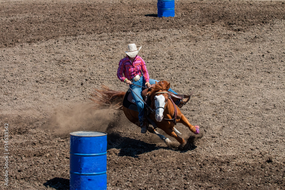 A rodeo cowgirl in a red shirt is riding a brown horse in a barrel racing competition. They are going around the barrel on the left side. The horse is kicking up a lot of dirt.