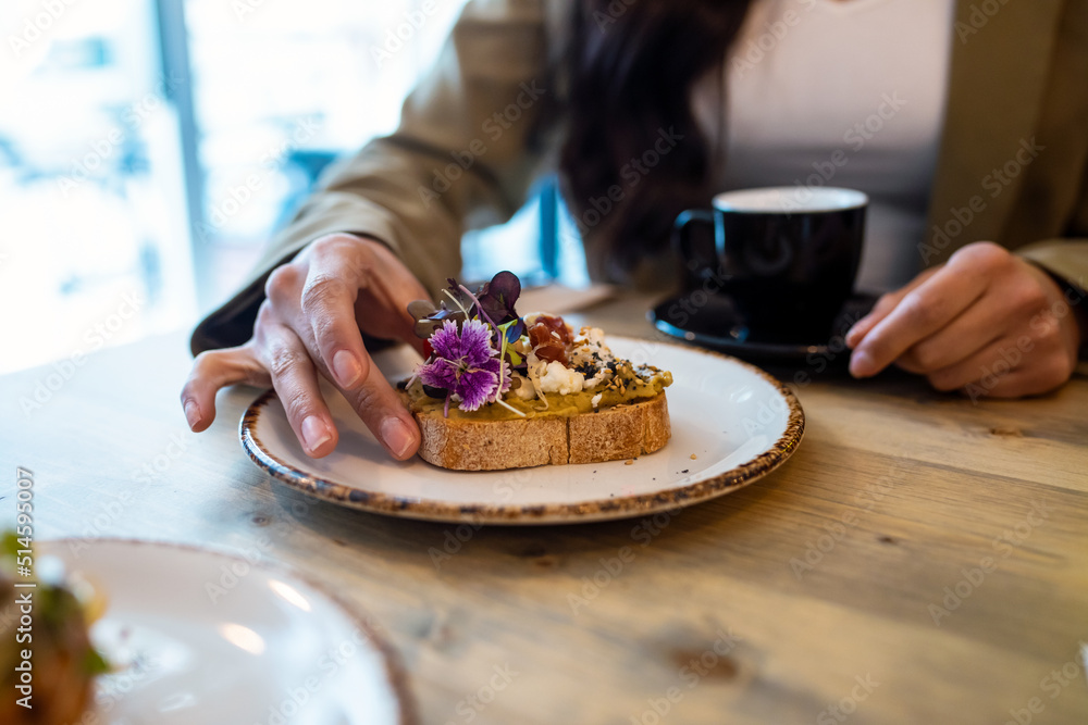 Close up of cool woman having healthy toast for breakfast in a healthy coffee shop.