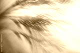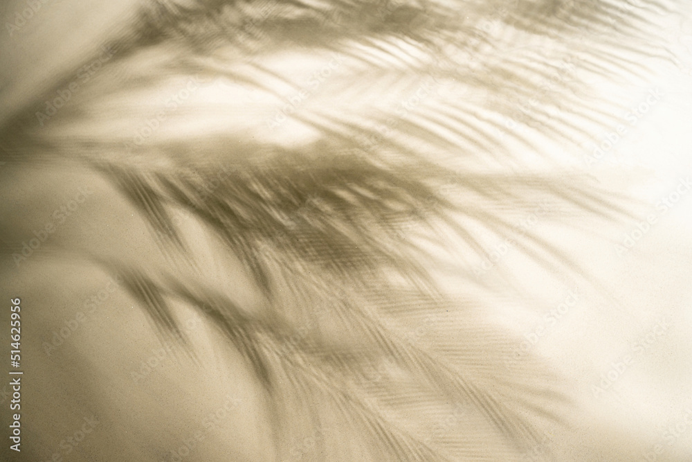 The shadow of a palm tree branch on the sand of a sandy tropical beach. Background, copy space, travel, summer concept.
