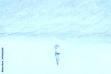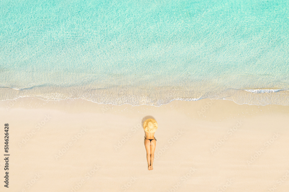 Top view of woman in bikini and straw hat lying and sunbathes on tropical Seychelles sea sand beach. Aerial, drone view