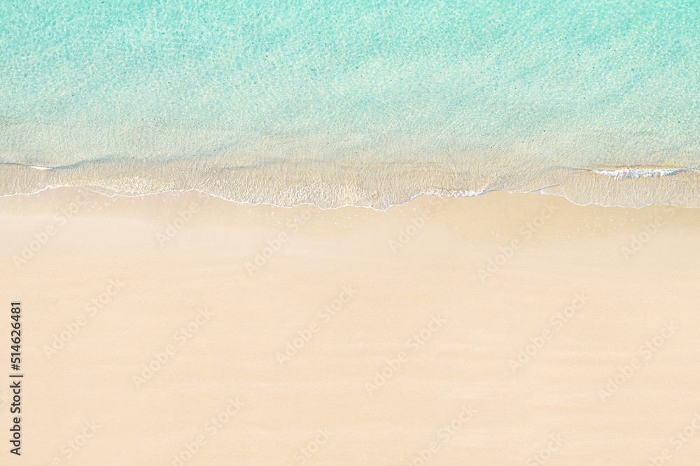 Top view of tropical Seychelles sand beach. Blue, turquoise transparent water surface of ocean, sea, lagoon. Horizontal background. Aerial, drone view