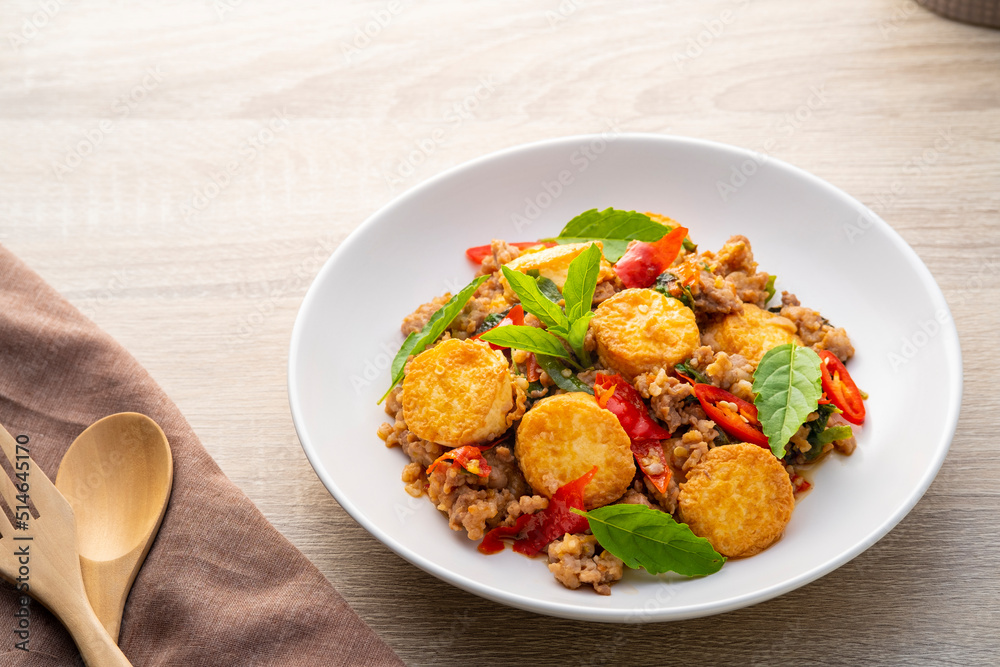 Stir fried basil with minced pork and eggs bean curd in white plate