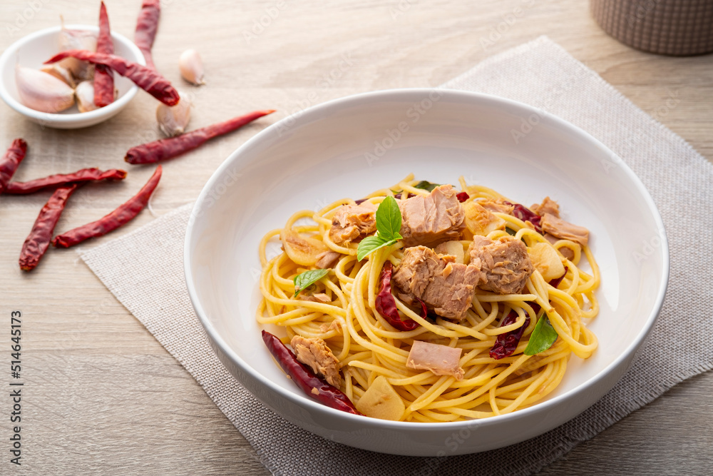 Canned tuna Spaghetti with Dried Chili and garlic in white plate.Fusion food