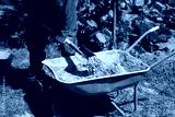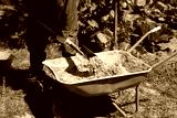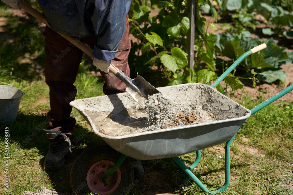 Summer work in the garden. A man kneads cement mortar with a shovel in a garden wheelbarrow for the construction of a path in the garden.