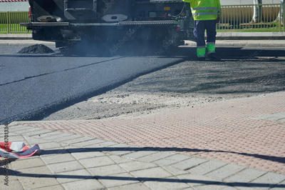 Side view of a paver, road paving machinery, being operated by workers to apply new asphalt that will be used to renovate a street. Bitumen and tar used to renew the pavement at roadwork.