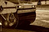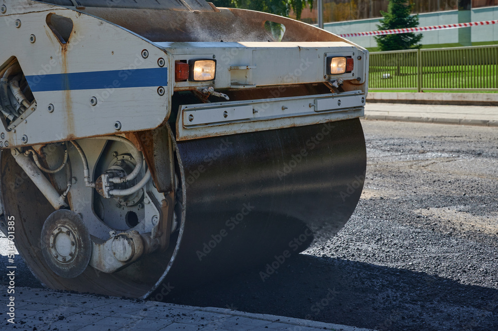 Road roller compactor at work being use on a renewal asphalt project. Compacting the blacktop layer on a street.