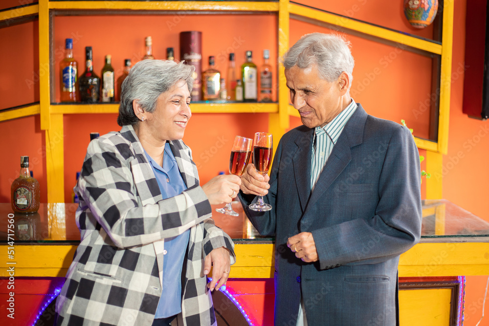 Happy indian business people holding glass of wine and champagne in hand, old senior man and woman corporate party to celebrate company success. Retirement life