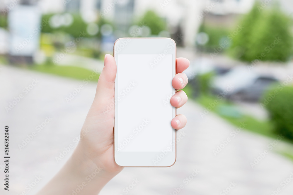 A female hand holds a white smartphone with a blank screen on a background of a city street