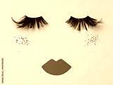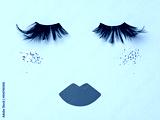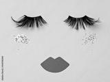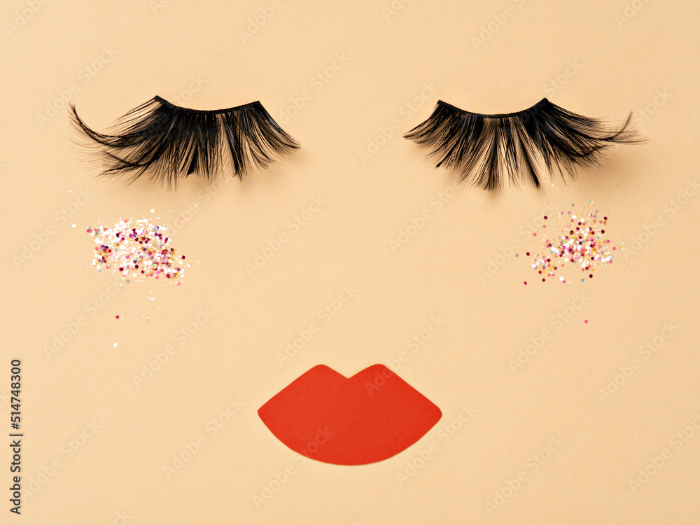 Abstract female face. Evening glittering makeup idea. False black feather lashes, neutral brown paper lips and shimmering blush on the beige backdrop. Evening make up concept flat lay.