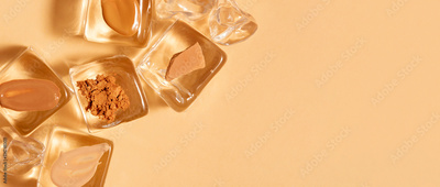 Summer makeup products.Samples of liquid foundation, concealer, compact powder on artificial ice cubes. Banner for professional makeup artist. Beige background. Summer face makeup, idea of cooling and