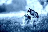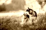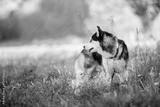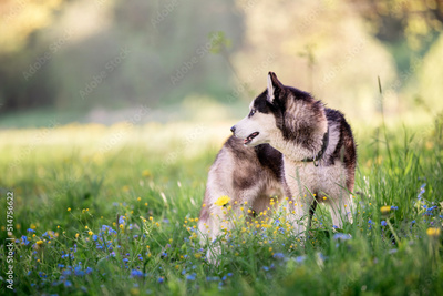 A charming dog of the Siberian Husky breed walks in a collar in nature in the park.