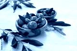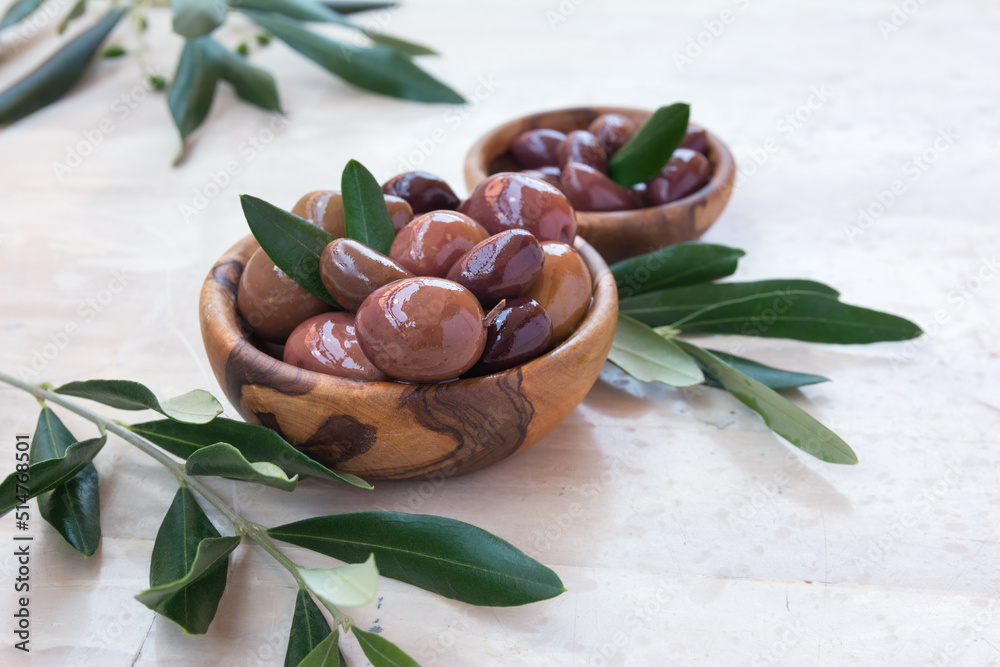 Wooden bowls with delicious olives