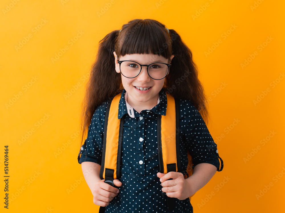 portrait of a schoolgirl girl with a backpack on a yellow background.