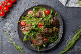 Steak salad with beef, aragula and tomatoes with sesame on black plate on dark stone table top view