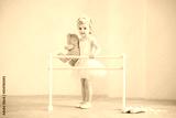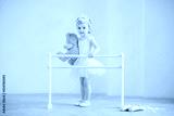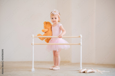 Cute blue-eyed baby ballerina in pink, standing near the ballet barre with a teddy bear in her hands. Dream concept of becoming a ballerina.