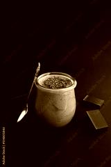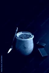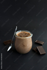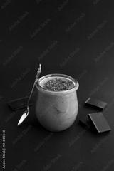 Natural milk yogurt with chocolate in the glass jar on the black background. Location vertical.