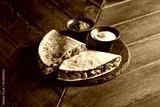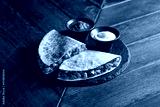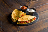 Mexican Quesadilla with chicken, vegetables, cheese and sauces on black stone plate