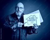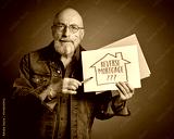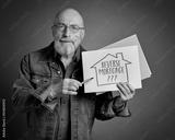 reverse mortgage question - senior man, businessman, mentor or advisor with handwritten sign, retirement financial concept