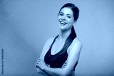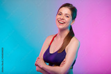 Smiling sporty woman in fitness sportswear standing with crossed arms. Female fitness portrait isolated on neon multicolor background.