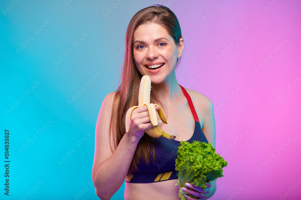 Vitamin and healthy food concept with smiling sporty woman holding salad bunch and banana. Female fitness portrait isolated on neon color background with healthy food.