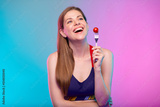 Smiling sporty woman in fitness bra holding red tomato on fork looking up. Female fitness portrait isolated on neon color background.
