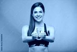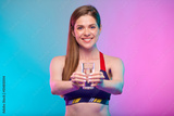 Smiling woman in sportswear holds water glass with two hands in front of her. Female fitness portrait isolated on neon multicolor background.