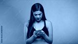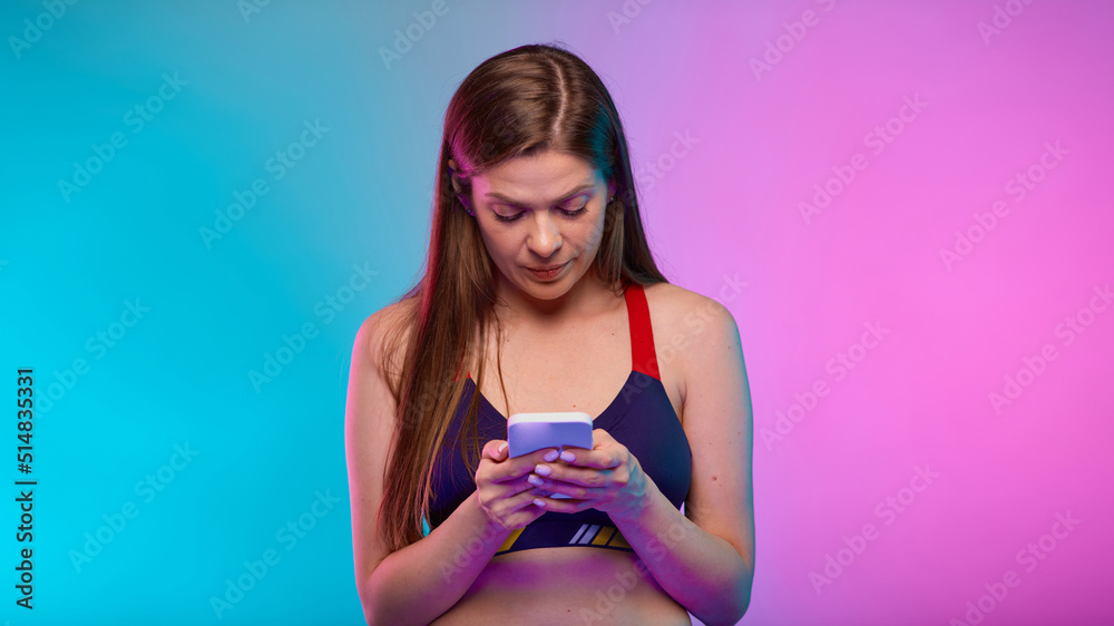 Sporty woman in fitness sportswear using smartphone. Female fitness portrait isolated on neon multicolor background.
