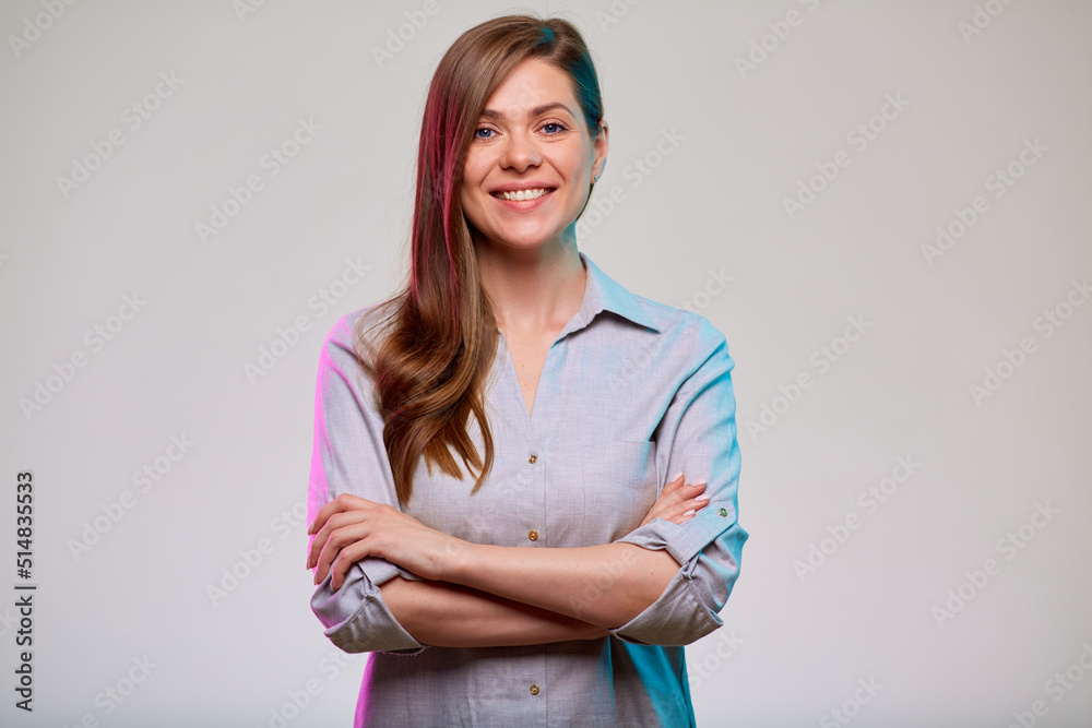 Woman with long hair wearing grey shirt standing with arms crossed.
