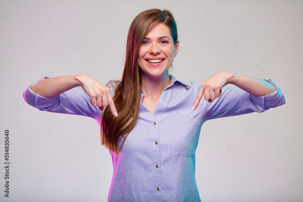 Smiling business woman pointing finger down isolated portrait. Photo with color filter.