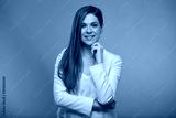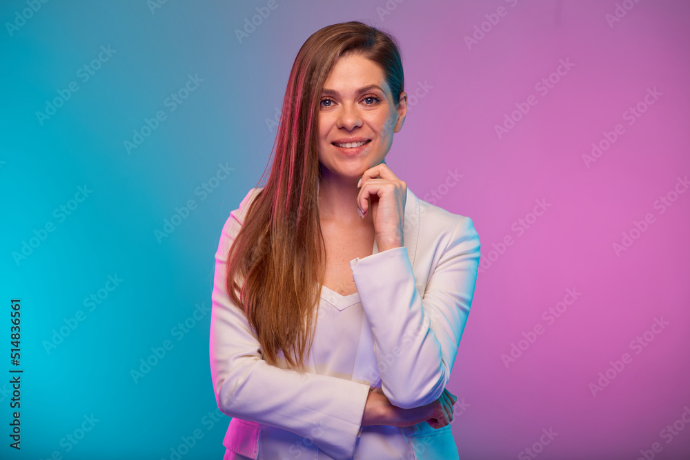 Smilng business woman touching her chin, face, isolated portrait with neon lights colors effect. Female model on neon colored background wearing white suit.