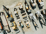 Parked heavy machinery and trucks. Industrial place, aerial view.