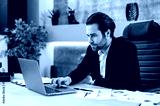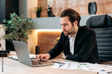 A smart serious caucasian businessman, a financial director, sits at a desk in a modern office, concentrated works in a laptop on a new project, develops a business plan, strategy, analyzes risks