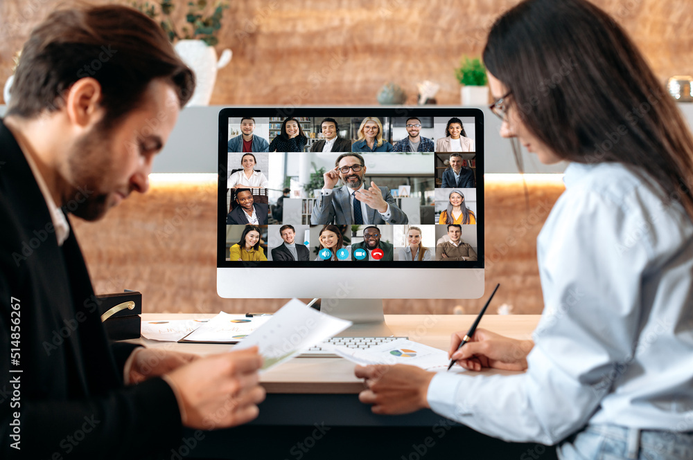 Teamwork, cooperation concept. Caucasian colleagues, a man and a woman, talking on a video conference with multiracial employees, using app and computer, discussing the dynamics of financial growth