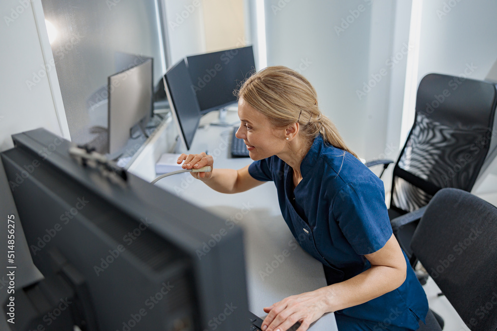 Nurse on Duty makes announcement into microphone at Reception Desk. High quality photo