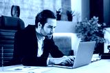 Focused clever caucasian programmer, business man, IT specialist, sits at the workplace in the office, looks concentrated at the laptop screen, works on a new project, develop new app, strategy