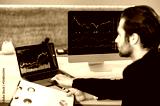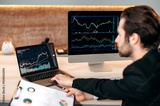 Smart focused caucasian male trader investor, analysing cryptocurrency financial market, looks at charts, working out a crypto strategy, analyzing risks. Investments, trading on the stock exchange