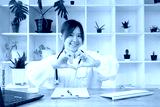In a hospital, a female doctor sits in her office and makes a heart-shaped gesture with her hand. At work, a woman makes a hand gesture.